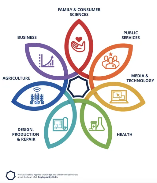 At the center of the Kansas Career Sunflower is an emphasis on workplace skills, applied knowledge and effective relationships — all essential for employability. For a more in-depth view of the pathways, you can view the 2024-2025 sunflower model here. Note: The updated sunflower model will have 15 career clusters and 32 pathways compared to the 16 career clusters and 36 pathways in the 2024-2025 model.