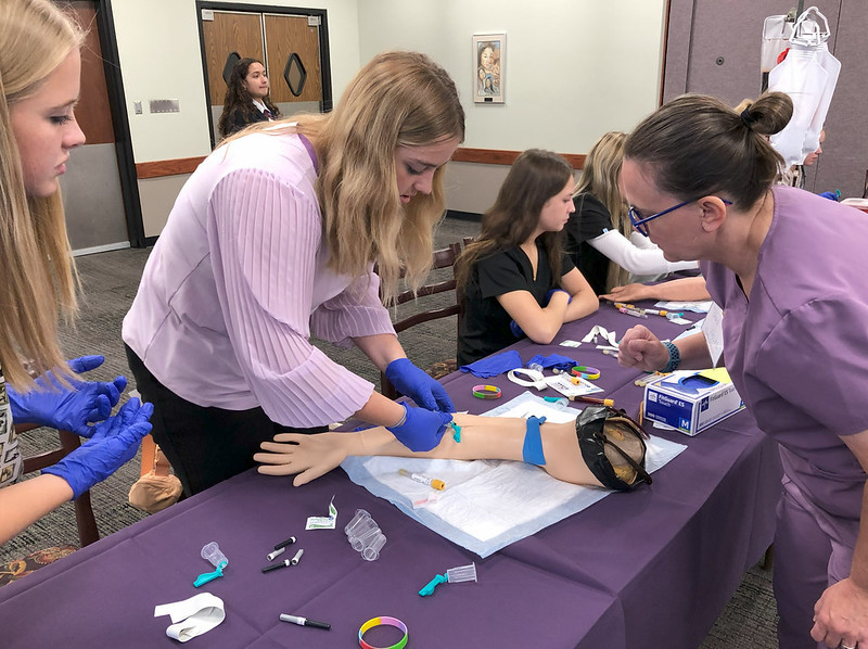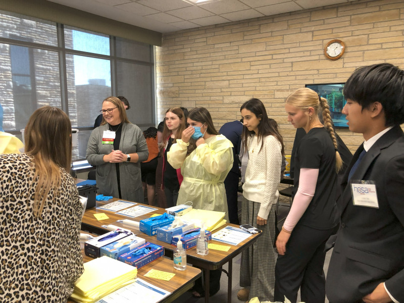 HOSA’s activities include a menu of competitive events offered at conferences. Options include test-only events, multi-round events with a test component plus a presentation, and skills-based events. Some events require a team entry. In the CPR event, for example, students enter a room in pairs, receive a scenario and must respond appropriately. Forensic science events are offered in partnership with a Washburn professor who brings students and sets up a crime scene. Teams enter the room, review the crime scene, then write a case study analysis.