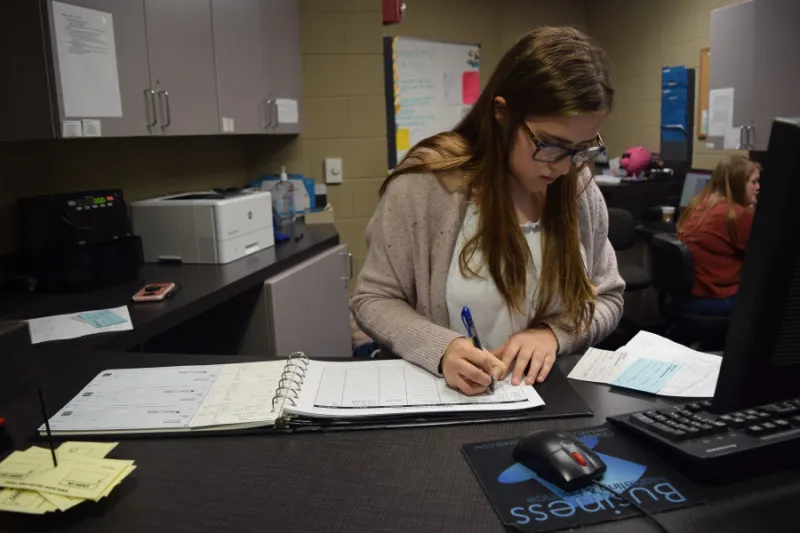 “Everything is dual controlled,” explained Brian McFall, business teacher, Washburn Rural High School. “So, every transaction is looked at several times. For example, if a customer makes a deposit, one student processes the paperwork, then another student checks that student's work. After that, someone enters it in the database. Then it goes to another student to be put in the paper ledger.”